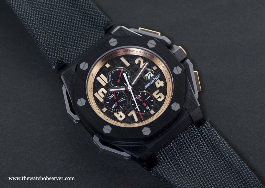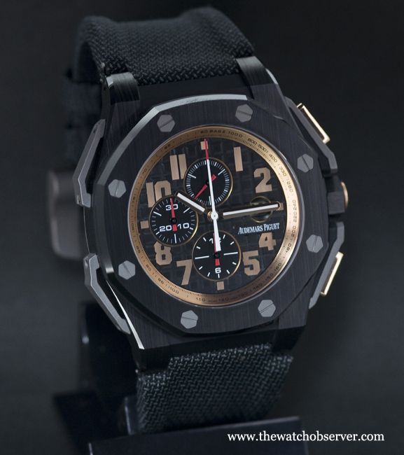 While most of the new Offshore models now come equipped with the standard 3126/3840 manufacture caliber introduced more than a year ago, we were disappointed to see that this Royal Oak Offshore Arnold Schwarzenegger The Legacy comes with the old 2326/2840 caliber!