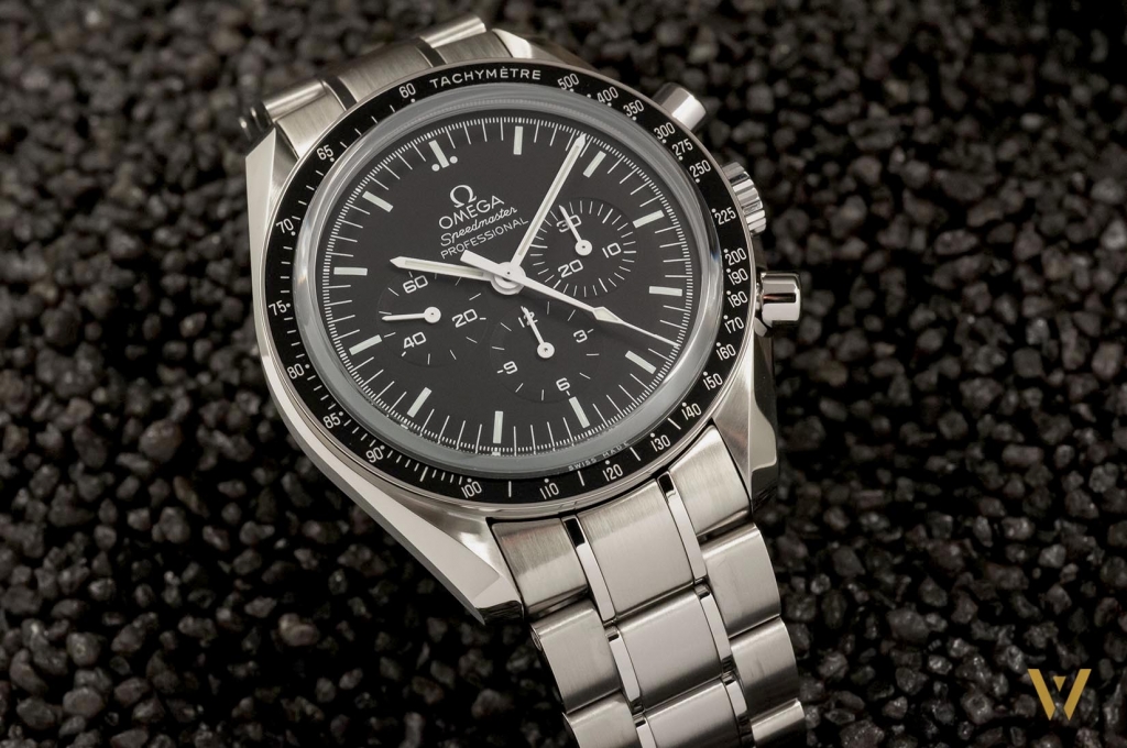 Indeed, the Omega Speedmaster Moonwatch is adorned with a matte black dial which absorbs light perfectly.